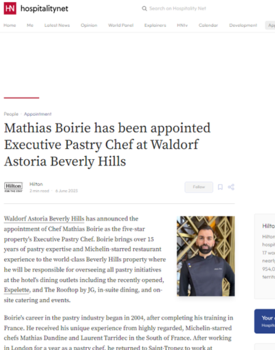 Mathias Boirie has been appointed Executive Pastry Chef at Waldorf Astoria Beverly Hills